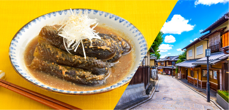 旬のなすに、ごま味噌ときび砂糖の甘みを合わせたおばんざい。お好みで冷やしても美味しく、ごはんがすすむ京都の家庭の味です。また、泥亀(どろがめ)は「スッポン」の別名で、その見た目から泥亀煮と言われています。