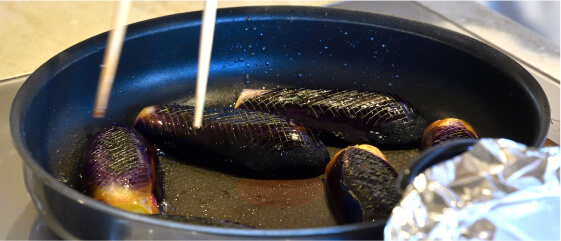京都の家庭料理のひとつ。きび砂糖の甘さと秋なすの相性の良い一品。