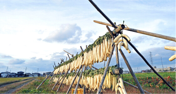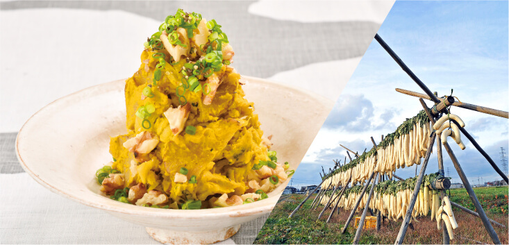 かぼちゃの深い甘みと、いぶりがっこの香ばしさがクセになる一品。古くから保存食として受け継がれてきた「いぶりがっこ」は、積雪が多い秋田で、大根を囲炉裏の上につるして燻製にし、米糠と塩で漬け込んで作られたことが発祥と言われています。
