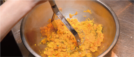 かぼちゃにはデンプン質が含まれているので、熱いうちに皮ごと潰す。かぼちゃをじゃがいもにすると、さっぱりとした味わいになる。