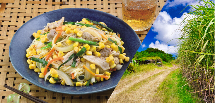 沖縄のソウルフードを現代風にアレンジした 見た目の鮮やかさと深い味わいが魅力の郷土料理。とうもろこしの甘みとさっぱりとしたそうめんの食感が絶妙にマッチした夏バテ気味でもツルッと食べられる一品です。