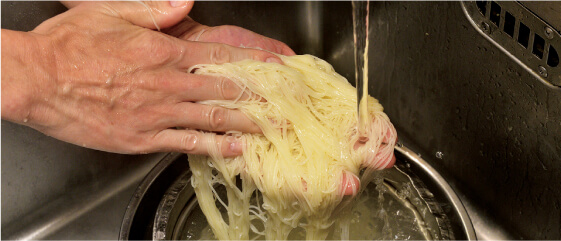 • ③ そうめんは表示時間より少し短くゆでる、冷水でもみ洗いしてしめてざるにあげ水けをきる。