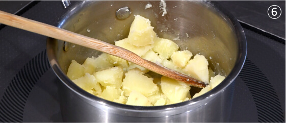 • ⑥ 湯を捨て、じゃがいもをから炒りして水けを飛ばす。熱いうちにボールに映し、木べらでつぶしながらAを混ぜ合わせる。