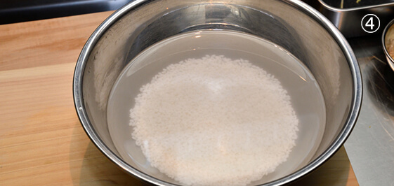 • ④ 米は研いで30分浸水させ、ザルに上げて水気を切る。