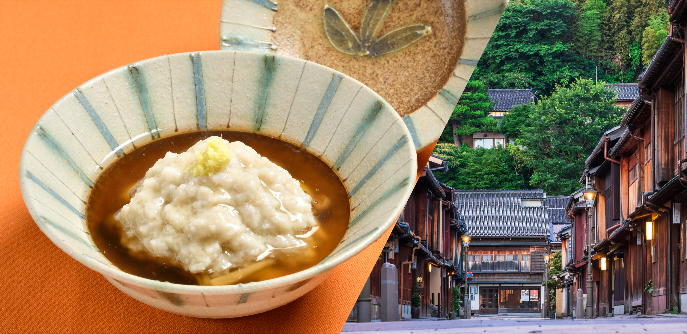 江戸時代からの長い歴史を持つ「加賀野菜」。特に、「加賀れんこん」はでんぷん質が多く、粘り強い食感が特徴の人気食材です。「はす蒸し」は、それをすりおろし、具材を加えた蒸し物で、もちもちとした食感が地元の人達から愛される郷土料理。そんな金沢の郷土料理「はす蒸し」をアレンジしたレシピです。
