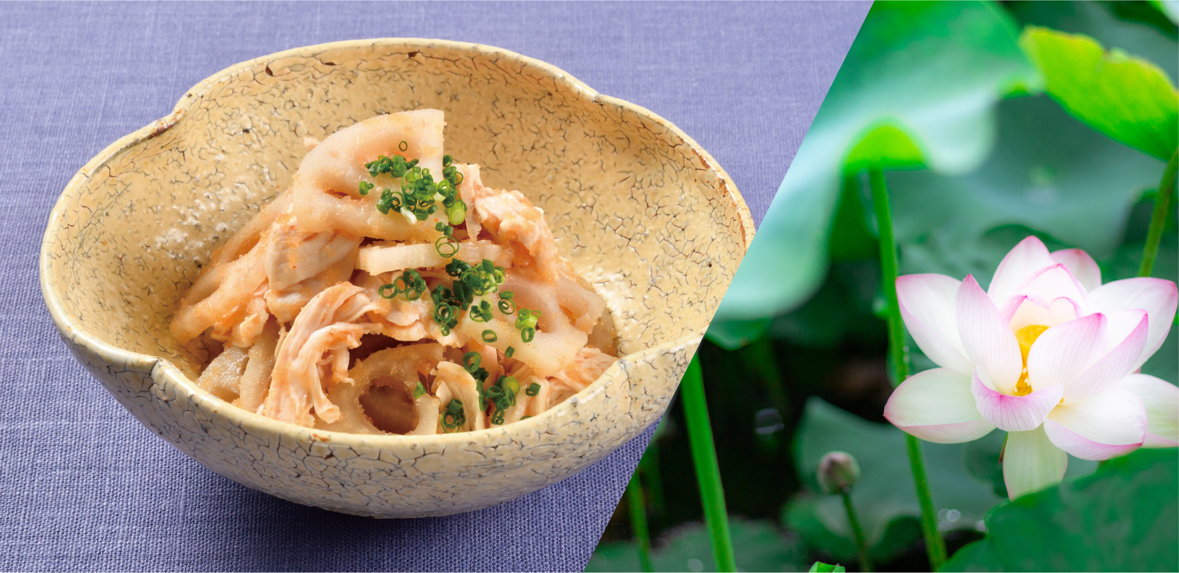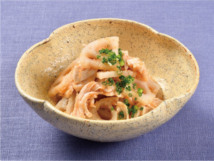 明太子の塩味ときび砂糖の甘みが効いた、れんこんのシャキシャキ感が楽しめるさっぱりとした一品。
