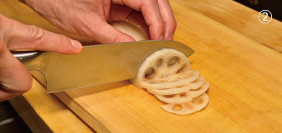 • ② れんこんは皮をむいて、薄切りのいちょう切りにする。さっと水で洗う。